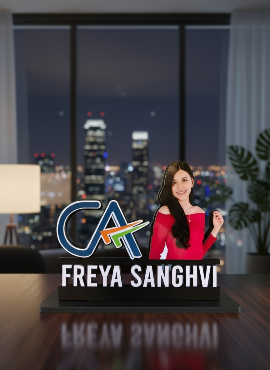 Showcase your professional identity with this elegant CA-themed desk nameplate, crafted from durable MDF material. Featuring the CA logo, your name in illuminated style, and a custom photo cutout, it’s the perfect blend of style and sophistication.