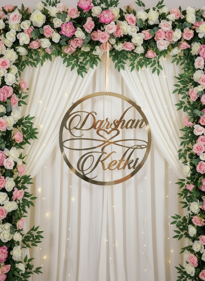 Make your celebration unforgettable with this personalized 23-inch acrylic name ring, a stunning centerpiece for weddings, engagements, anniversaries, and special events. Crafted with precision from premium-quality glossy acrylic, this elegant round name board features your custom names in a stylish cursive font — perfect for capturing attention and enhancing your event decor.