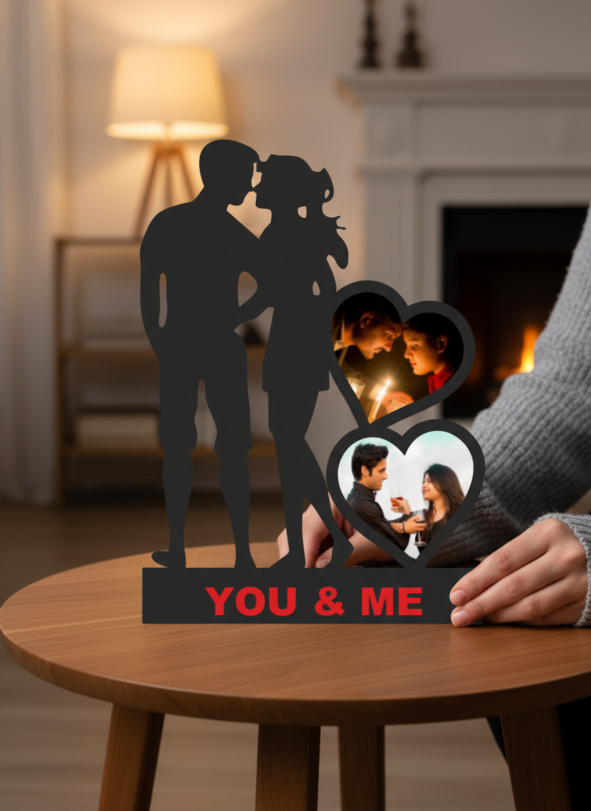 Celebrate your love with our You & Me Couple Table Photo Frame! This elegant silhouette design features two heart-shaped photo slots, perfect for displaying your sweetest memories. Crafted for a premium look, it’s ideal for gifting on anniversaries, Valentine’s Day, or special moments. A beautiful décor piece for your bedroom, living space, or office desk — this frame adds warmth and romance wherever it’s placed.